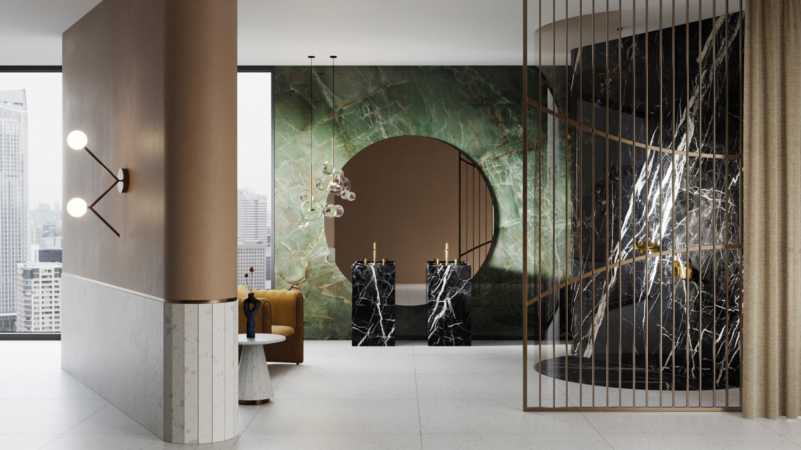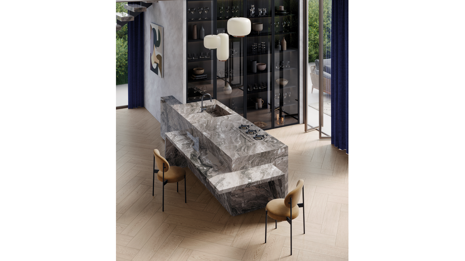 Taking black Marquina marble as a starting point, the Marquina Black collection is one of this season’s most striking, with its light and shade contrasts and refined white veins. The range of darker marbles includes Orobico Grigio, with variegated greige tones that reflect nature’s purest side.